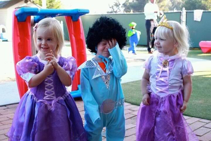 I chose Kevin's costume this year based on the fact that he likes to dance. I saw this 70's 'Disco King' costume and thought it was absolutely adorable, so I got it. Well, it turned out to be even more perfect because as you can see from the picture to the left, he is a total ladies man. That is Lily (left) and Riley (right), his two bestest girlfriends at school. I hear all about "Ri-ey" and "Yi-Yi" every day when I pick him up. And this picture taken by Riley's mom at the Halloween parade at school just sums it up.